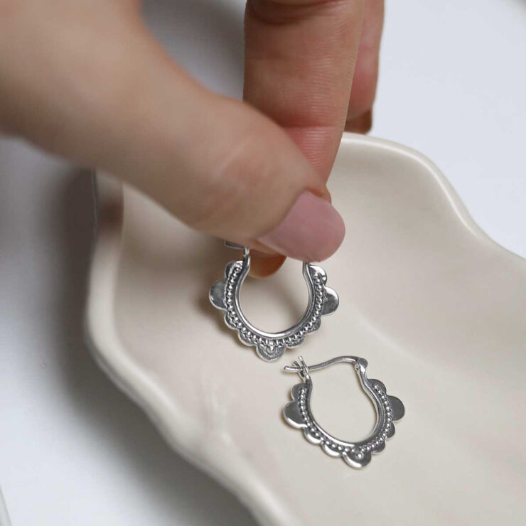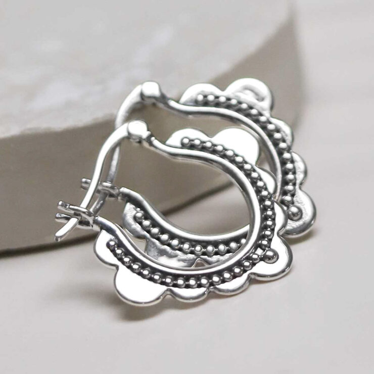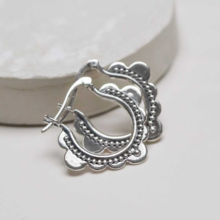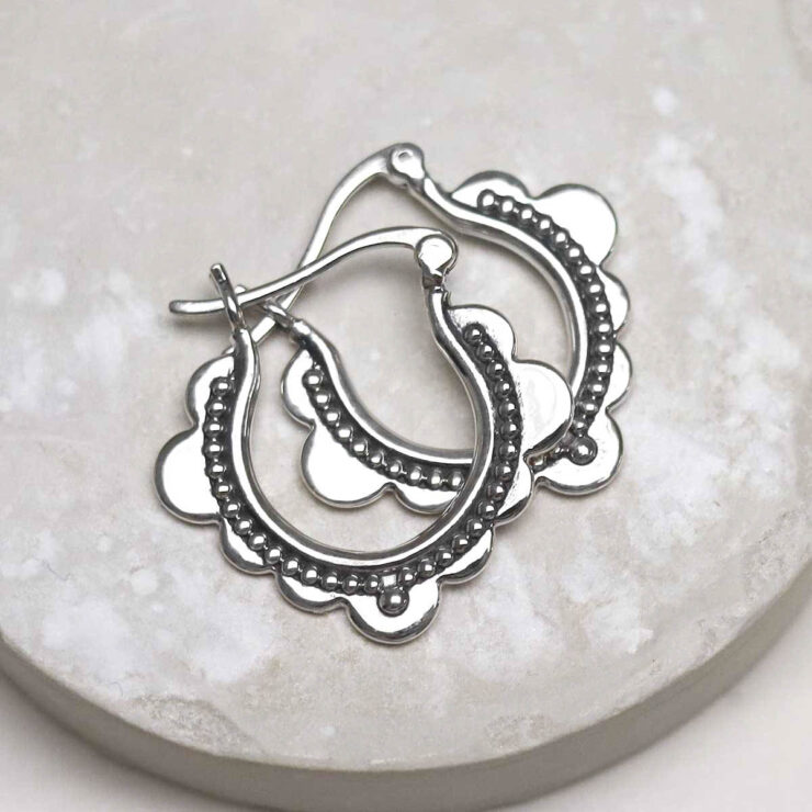 Borrowing pattern from Moroccan design and heavily reminiscent of traditional middle eastern architecture such as decorative doorways, the sterling silver hoops feature a scalloped edge adorned with oxidised detail. They are your portal to an exotic dream.