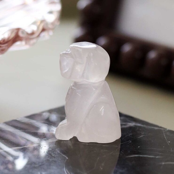 Adorable carved dog figurine made from genuine rose quartz, known as the stone of love and compassion. This charming piece features soft pink hues and smooth polished details, with natural inclusions that make each one unique.