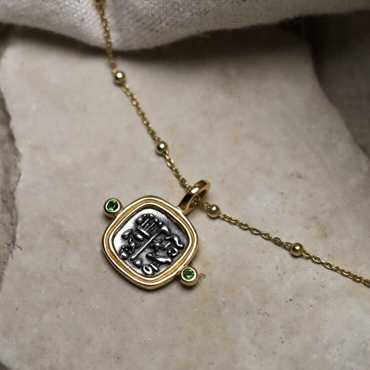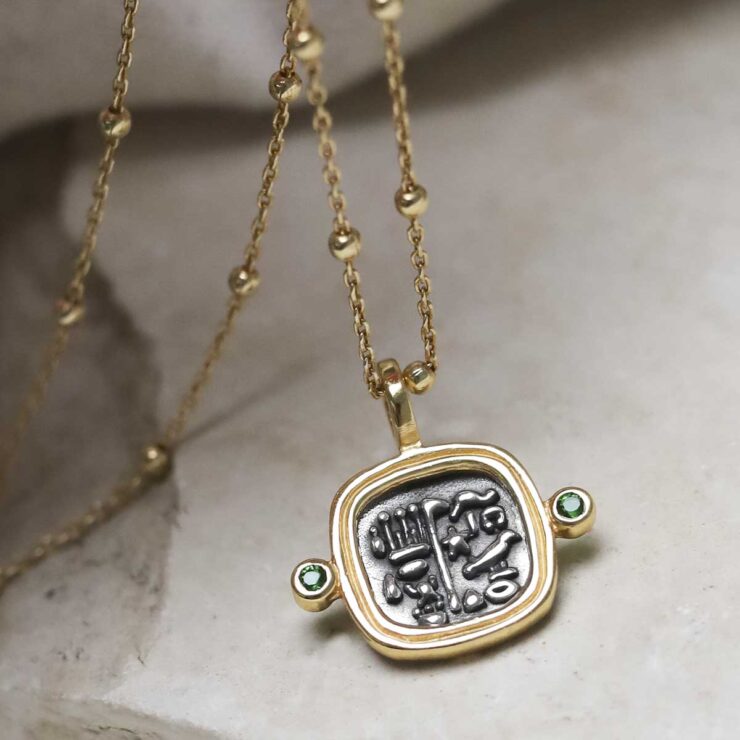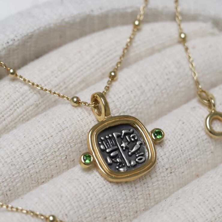 Enhance your jewellery collection with this Gold Plated Sterling Silver Hieroglyphics Square Necklace. The pendant features a rounded square shape with Green Cubic Zirconia gemstones on each side. This design has detailed intricate hieroglyphic inspired engravings, bringing a hint of ancient mystery to a modern design. Crafted from sterling silver and finished with a warm gold plating, it is lightweight, versatile, and perfect for adding something a little different to your everyday jewellery. A simple piece with character, ideal for anyone who loves jewellery with a story.