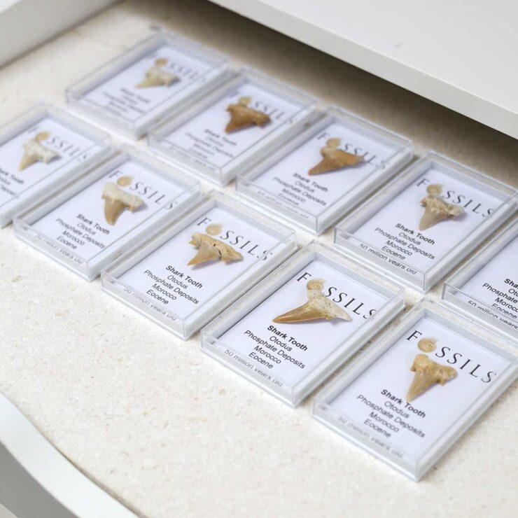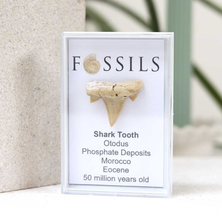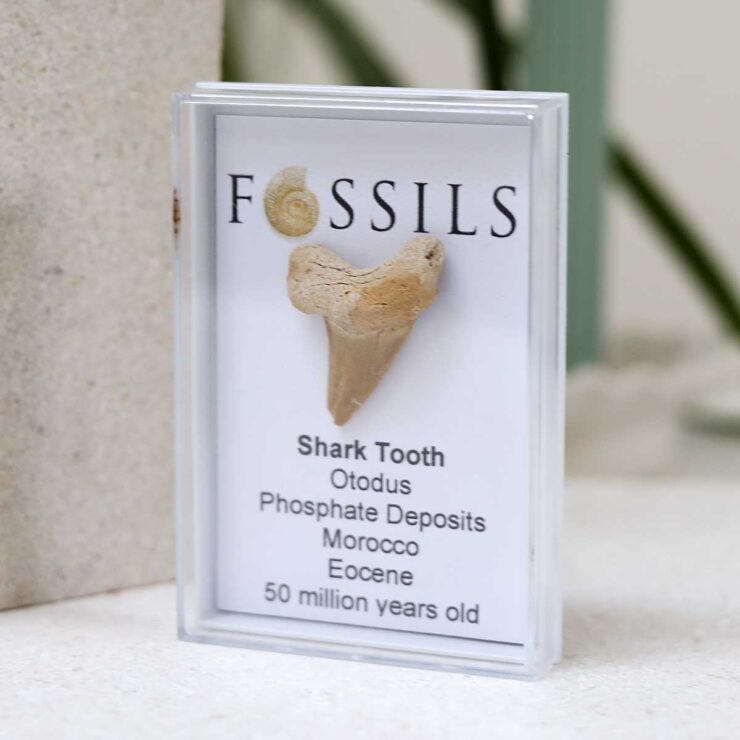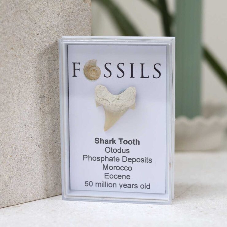 Authentic fossil shark tooth from the extinct Otodus, sourced from Morocco’s phosphate deposits. Dates to the Eocene period, approximately 50 million years old.