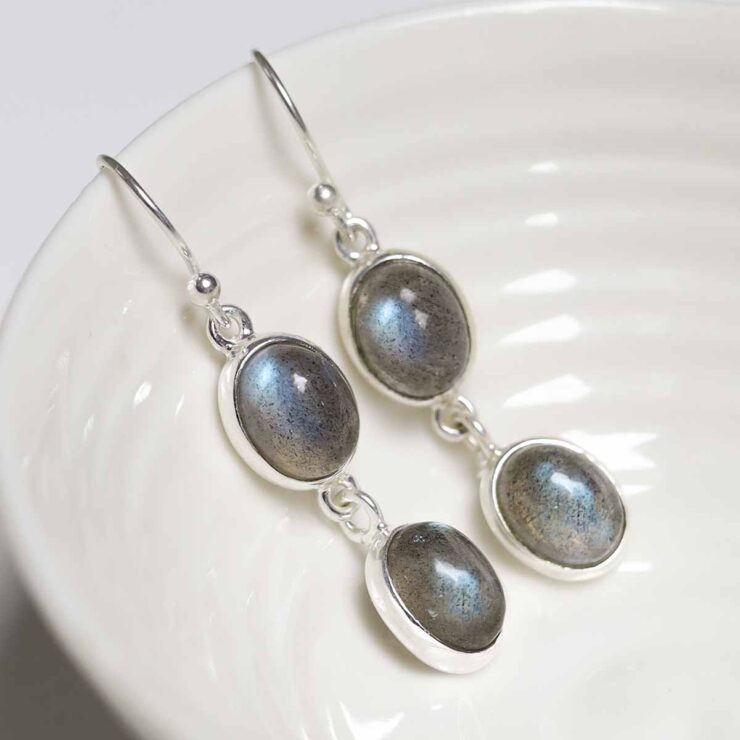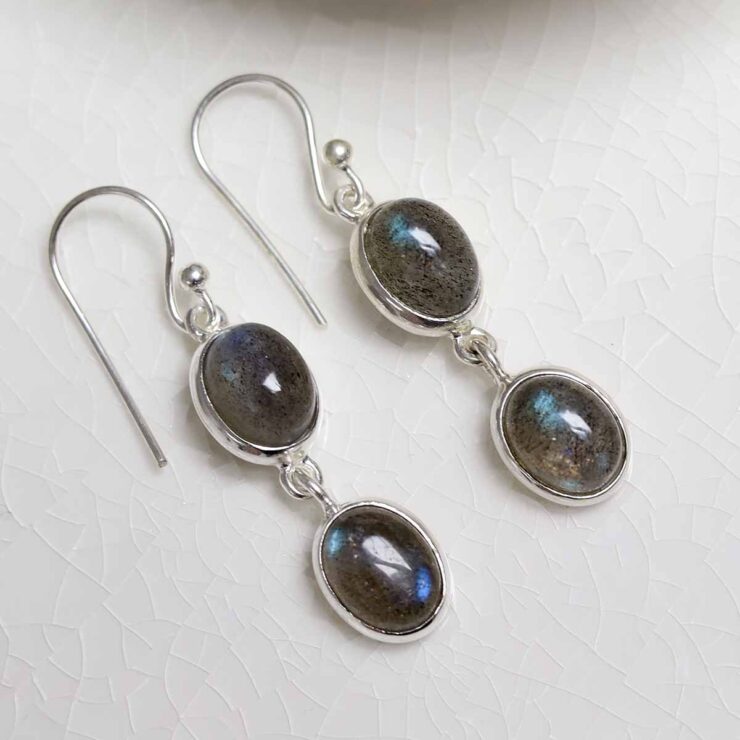 Our stunning Silver Silver Double Labradorite Dangly Oval Earrings are available in either Sterling Silver or 24 carat Gold plated sterling silver. A perfect addition to any outfit.