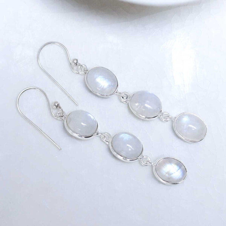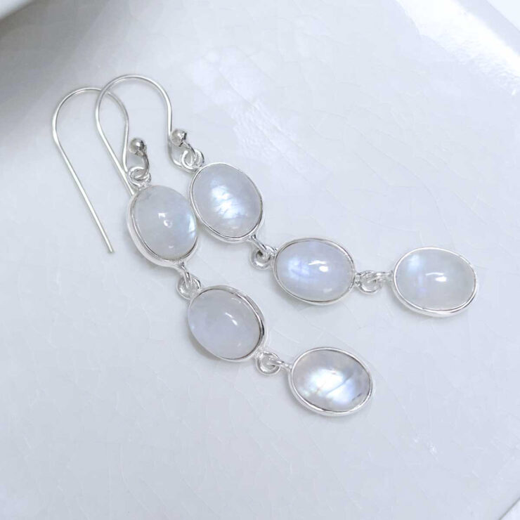 Our stunning Sterling Silver Triple Moonstone Dangly Oval Earrings are available in either Sterling Silver. A perfect addition to any outfit.