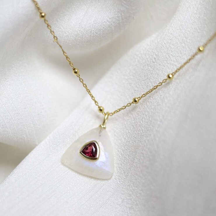 • Made from Moonstone, Garnet and recycled sterling silver 18ct gold plated.