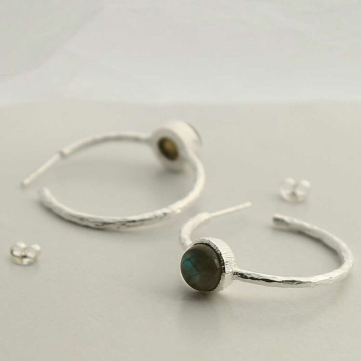 Our Sterling Silver Labradorite Hoop Studs are a truly contemporary design for special occasions. With studs to keep them from slipping out of your ears and a lovely organic finish that shimmers in the light. Labradorite is the birthstone for September and brings beautiful depth to any outfit.