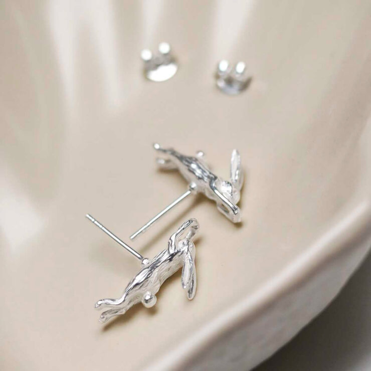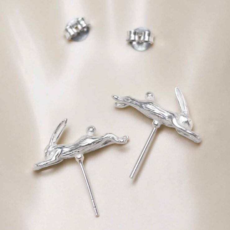 Our Sterling Silver Leaping Hare Stud Earrings will make you feel as free as a hare frolicking through the English countryside. Those that love motifs from nature will be charmed by this subtle sterling silver hare – its delicate features and polished surface catch the eye.