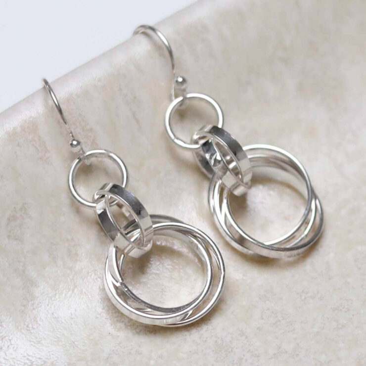 Their design takes it’s inspiration from the famous Russian wedding ring. Three interlocking rings form the main part of the earring, suspended on a further two interlocking rings.