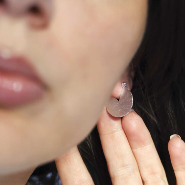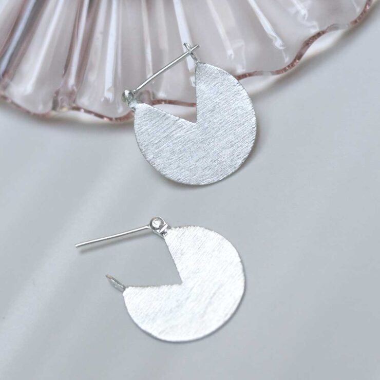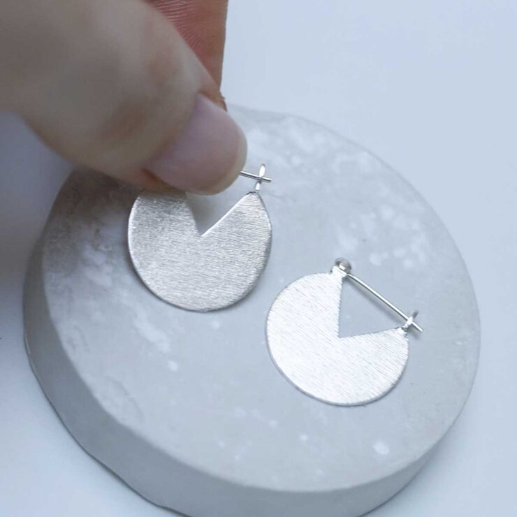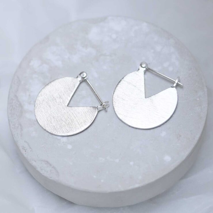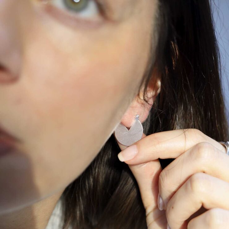 Their design features a textured circle with a triangular slice missing. This gives the earrings the appearance of a cake which has had a piece removed.