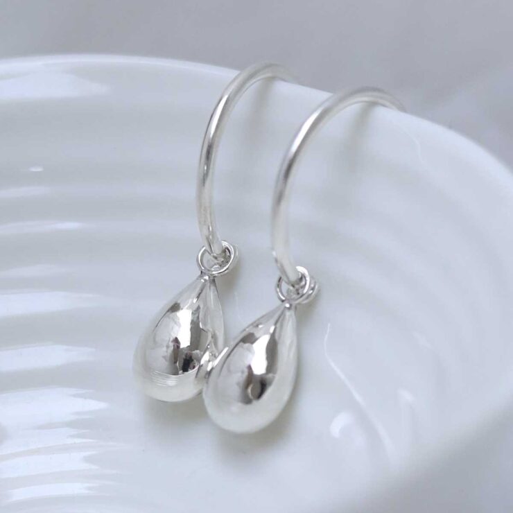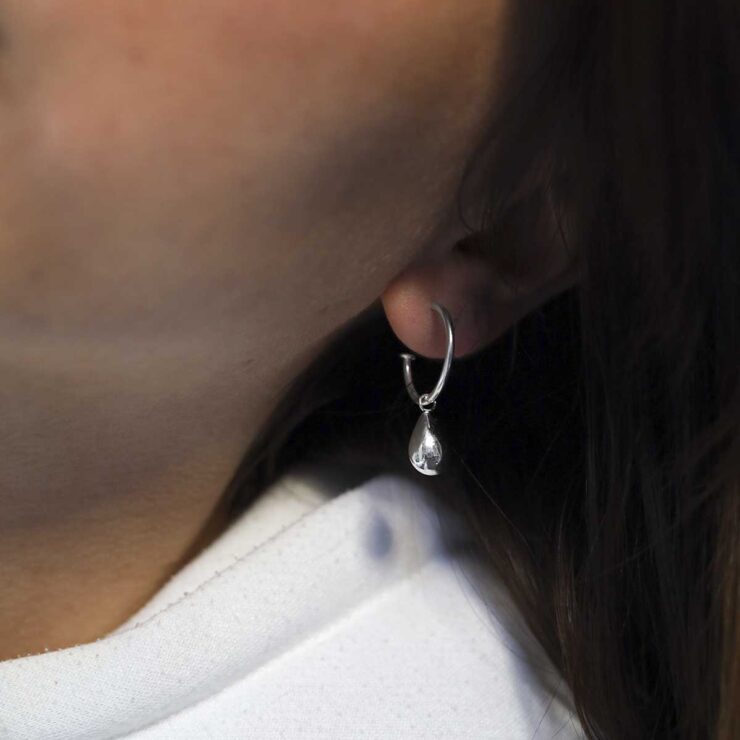 Their design features a simple teardrop charm on a plain three quarter hoop stud. This gives these earrings a fantastic liquid metal look